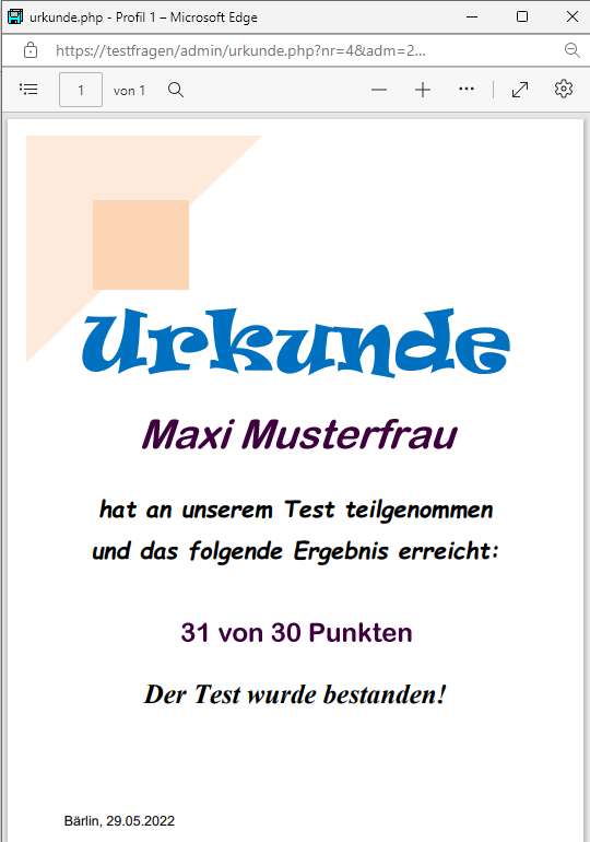 - das Ergebnis kann in einem PDF-Dokument als Urkunde oder Zertifikat bescheinigt werden (optionales Zusatzmodul)
